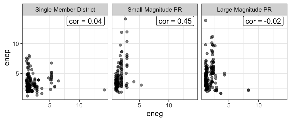 # compute correlation between enep and eneg for each electoral system