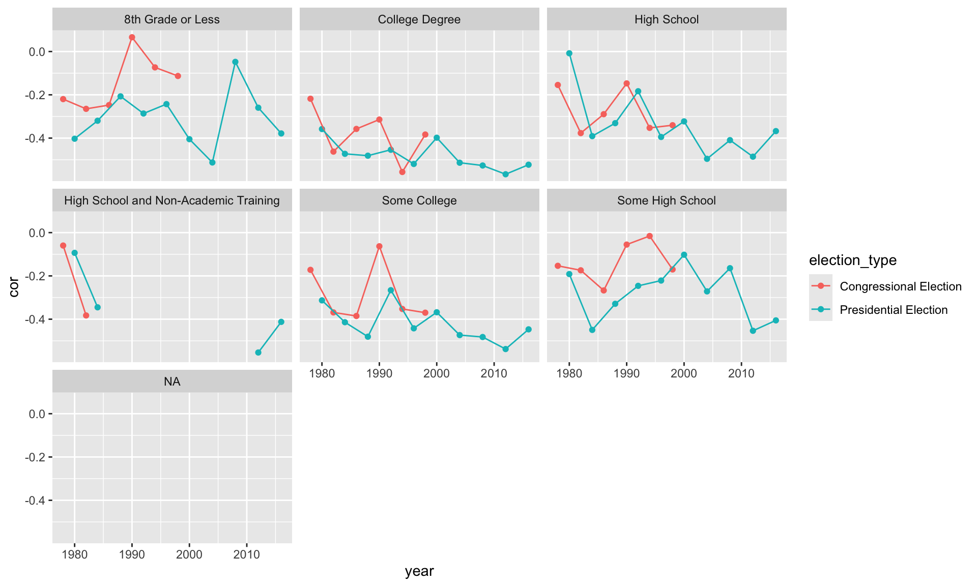 Below, I compute the correlation between feelings toward the Democratic and Republican parties. It makes sense that this correlation should be negative. As respondents’ feelings toward the Democratic party grow warmer, their feelings toward the Republican party should grow cooler. We might also expect this correlation to be stronger among more educated respondents and change over time.