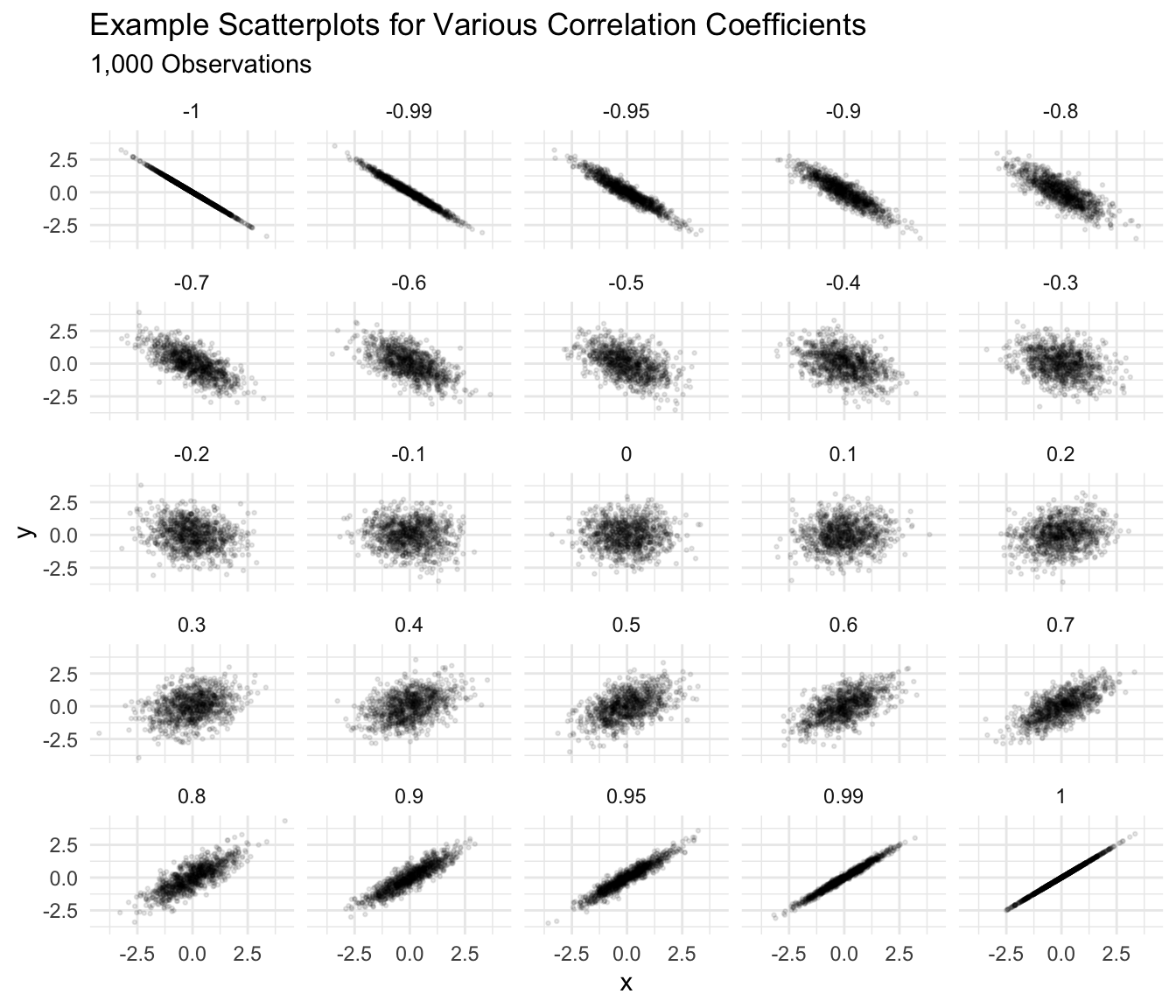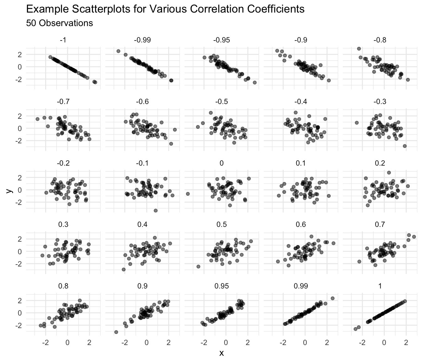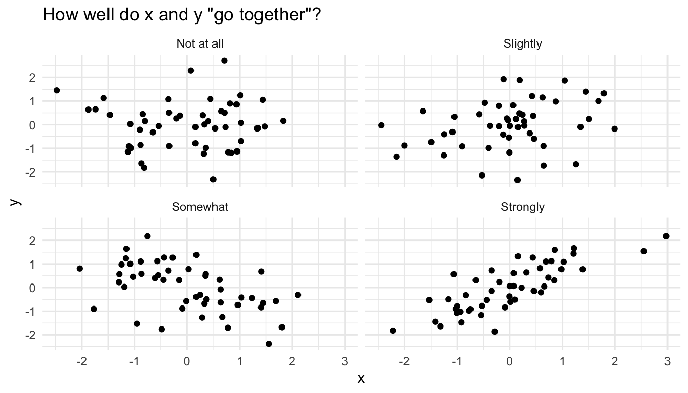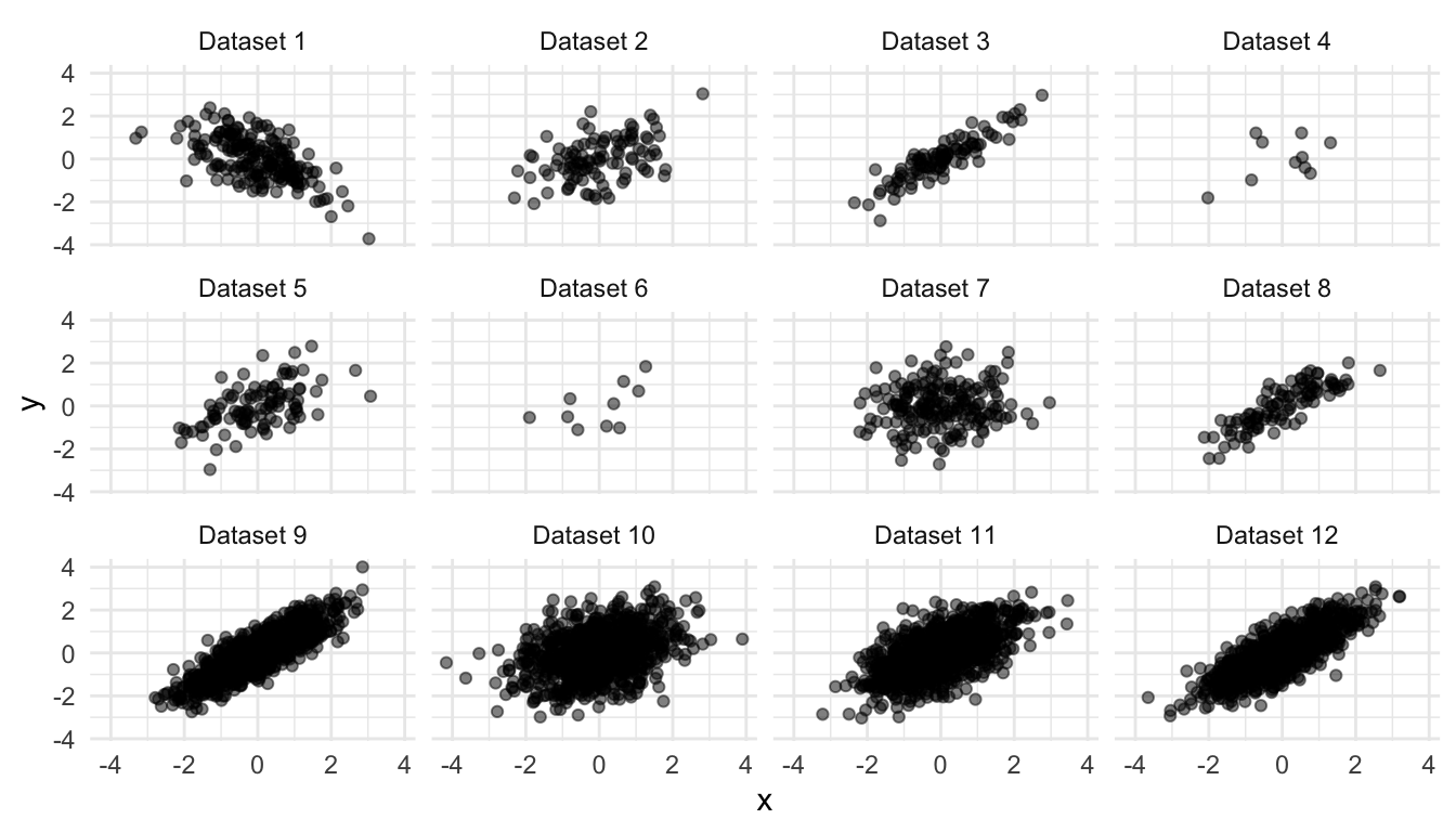 ) for each dataset. How do they compare? How would you describe the strength of the relationship between \(x\) and \(y\) in each panel? Would you say that the correlation coefficient offered a good summary of each dataset?