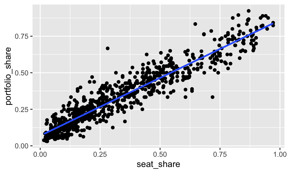 method = "lm" to geom_smooth().se = FALSE to geom_smooth().ggplot(gamson, aes(x = seat_share, y = portfolio_share)) +