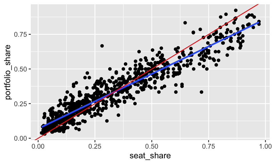 In the case of Gamson’s law, the line \(y = x\) is theoretically relevant. It’s not the regression line, it’s the line that indicates a perfectly proportional portfolio distribution. To include it, we can use geom_abline().