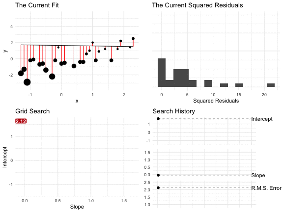 class: center, middle, inverse, title-slide .title[ # Regression ] --- class: center, middle ### a regression model is just an equation for a scatterplot --- class: center, middle # `\(y_i = \alpha + \beta x_i + r_i\)` <img src="sl-regression_files/figure-html/unnamed-chunk-2-1.png" style="display: block; margin: auto;" /> --- class: center, middle # What's a good line? --- class: center, middle # The Conditional Average --- class: center, middle <img src="sl-regression_files/figure-html/unnamed-chunk-3-1.png" style="display: block; margin: auto;" /> --- class: center, middle <img src="sl-regression_files/figure-html/unnamed-chunk-4-1.png" style="display: block; margin: auto;" /> --- class: center, middle <img src="sl-regression_files/figure-html/unnamed-chunk-5-1.png" style="display: block; margin: auto;" /> --- class: center, middle <img src="sl-regression_files/figure-html/unnamed-chunk-6-1.png" style="display: block; margin: auto;" /> --- class: center, middle <img src="sl-regression_files/figure-html/unnamed-chunk-7-1.png" style="display: block; margin: auto;" /> --- class: middle Two facts: 1. The average is the point that minimizes the RMS of the deviations from the average. 1. We want a line that captures the *conditional* average. Just as the *average* minimizes the RMS of the deviations *from the average*, perhaps we should choose the **line** that minimizes the RMS of the deviations (or "residuals") **from the line**. --- class: center, middle ## that's exactly what we do. --- class: center, middle **We want the pair of coefficients `\((\hat{\alpha}, \hat{\beta})\)` that minimizes the RMS of the residuals or... ** `\(\DeclareMathOperator*{\argmin}{arg\,min}\)` `\begin{equation} (\hat{\alpha}, \hat{\beta}) = \displaystyle \argmin_{( \alpha, \, \beta ) \, \in \, \mathbb{R}^2} \sqrt{\frac{r_i^2}{n}} \end{equation}` --- class: center, middle # HTF do we find this minimum??? --- class: center, middle ## grid search --- class: center, middle  --- class: center, middle # Numerical Optimization We need to minimize.... `\(f(\alpha, \beta) = \displaystyle \sqrt{\frac{\sum_{i = 1}^n r_i^2}{n}} = \sqrt{\frac{\sum_{i = 1}^n (y_i - \hat{y}_i)^2}{n}} = \sqrt{\frac{ \sum_{i = 1}^n [y_i - (\alpha + \beta x_i)]^2}{n}}\)` --- class: center, middle