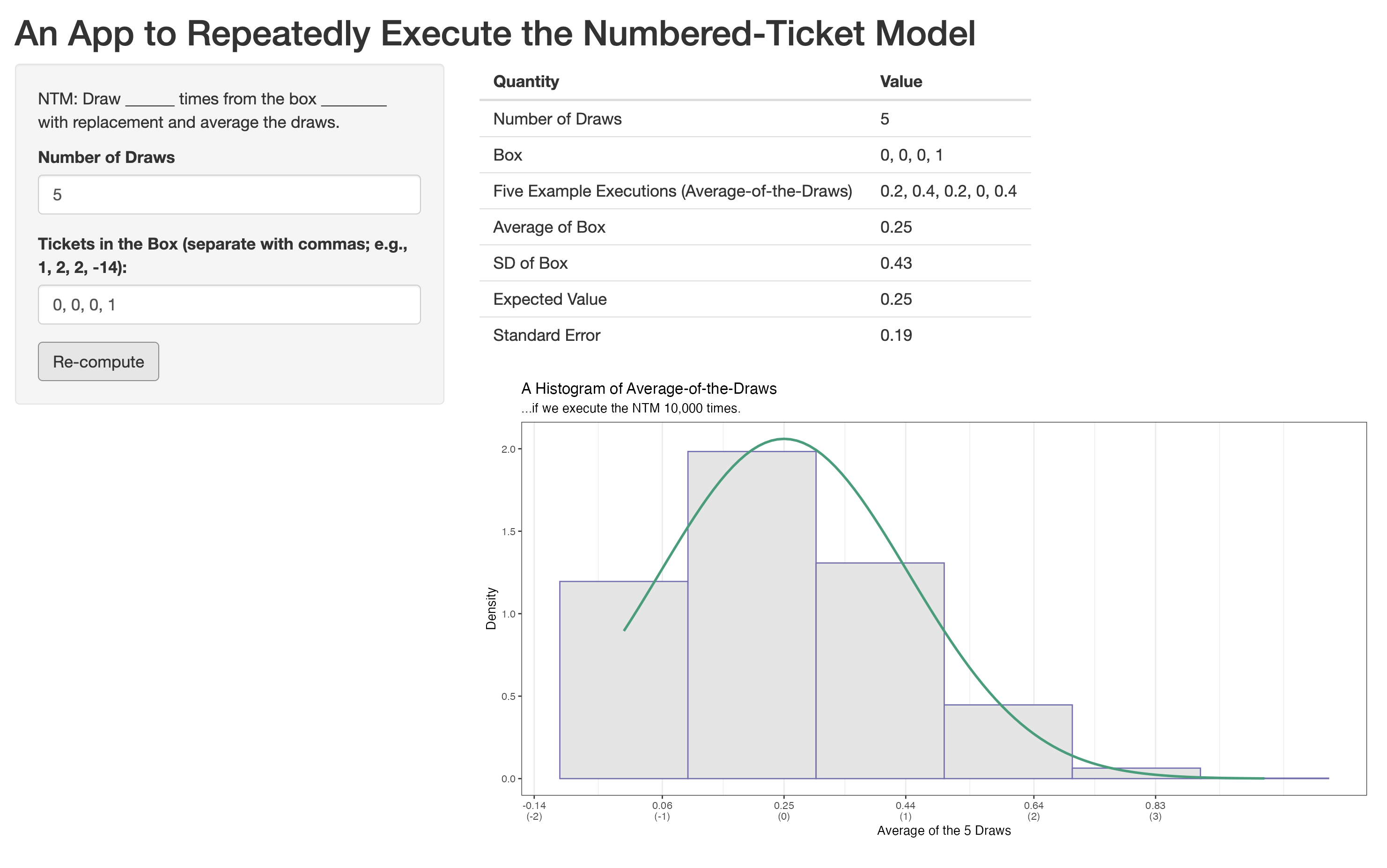 Numbered-Ticket Model: Fill a box with \(k\) tickets numbered with \(t_1\), \(t_2\), \(t_3\), …, \(t_k\). Draw \(N\) times with replacement from the box. Record the average of the draws.
