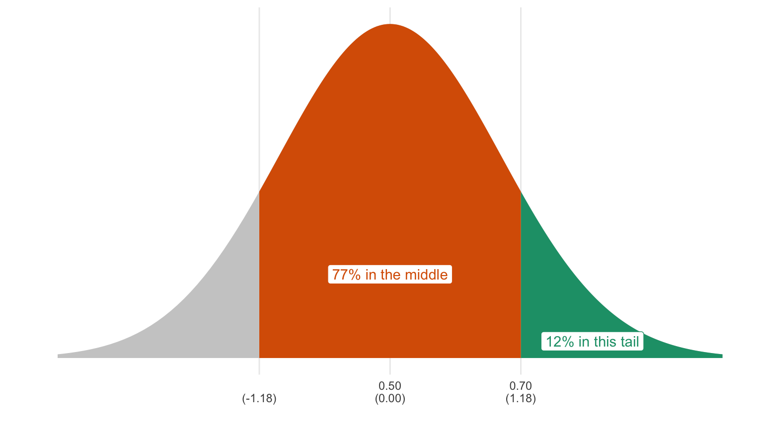 - The quantity of interest 0.7 is (0.7 - 0.5)/0.17 = 1.18 SEs above the average. That’s the z-score.