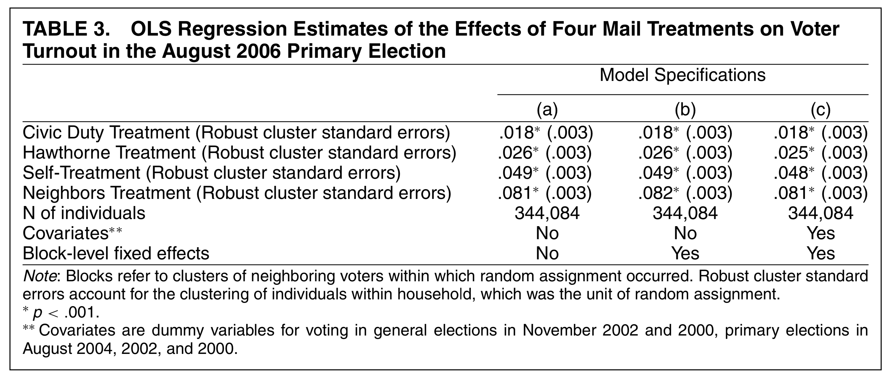As an example, see Table 3 below from Gerber, Green, and Larimer (2008). The numbers are estimates of the treatment effect of each mailer (compared to the control group that received no mailer). Each estimate is statistically significant, which means we’re confident the observed differences are not due to chance.